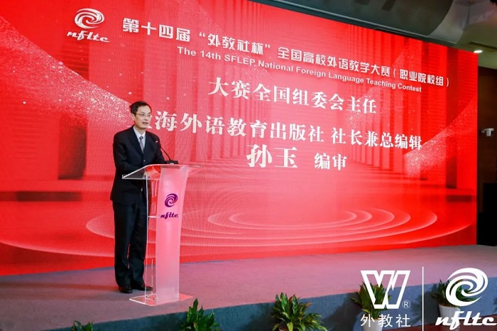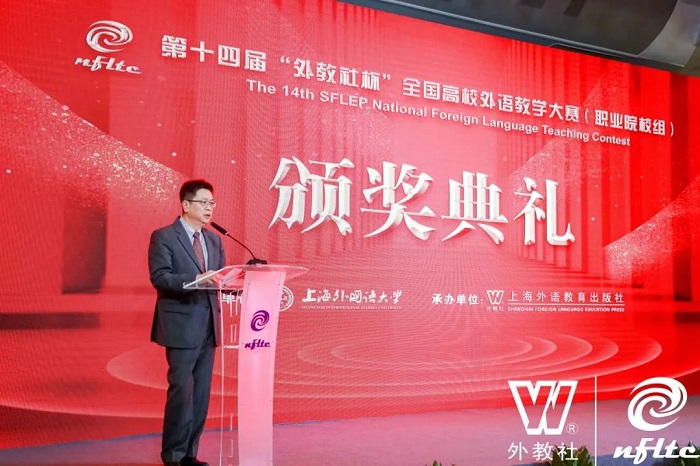 典礼最后,大赛全国组委会主任、上海外语教育出版社社长兼总编辑孙玉编审指出,大赛的成功举办离不开专家、评委们的辛勤付出,离不开协办单位的共同努力。“外教社杯”教学大赛是真实课堂的浓缩,是教师风采的集中体现,是广大高校外语教师学习借鉴的优质素材。本届大赛的教学内容上不仅凸显了职业院校外语教学的特点,还体现了 “二十大”报告精神以及习近平文化思想,总决赛说课文本更是体现了中国绿色发展的理念和成就,这充分说明“培根铸魂,启智增慧”的教育理念已经深植于我们的教学中。