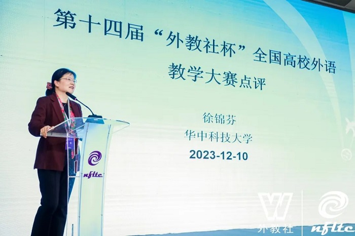 华中科技大学徐锦芬教授代表评委组对大赛全国决赛和总决赛作点评。她首先对大赛的总体情况进行了评价,指出了本届比赛中闪现的诸多亮点:如选手们普遍能精心设计教案,绝大部分选手关注了《高职英语课标(2021年版)》,绝大部分选手口语流利、教态自然、台风沉稳,体现出了较好的综合专业素养。同时,她也对选手们提了一些建议,比如教师应更加充分地挖掘和处理文本内容,教学设计应具有更好的关联性,要适当增加授课的灵活性,要更加关注课堂教学有效性的体现等。