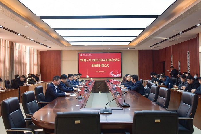 为传承和弘扬优秀传统文化,持续推进“书香河南”建设,12月8日上午,郑州大学出版社向安阳师范学院捐赠图书仪式暨专家辅导报告会在安阳师院勤业楼A106会议室举行。安阳师范学院副校长张建国,图书馆副馆长赵新顺,教务处副处长熊小伟;郑州大学出版社社长、总编辑孙保营,副总编辑崔青峰,副社长李海涛等出席捐赠仪式。郑州大学出版社党政综合办公室、社科分社、医学分社等部门负责人,安阳师院相关部门及院系负责人共40余人参加捐赠仪式。捐赠仪式由安阳师范学院教务处处长肖建清主持。
