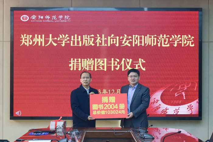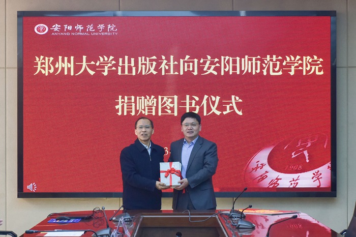 捐赠仪式上,张建国代表安阳师范学院接受捐赠,并为郑州大学出版社颁授捐赠证书。