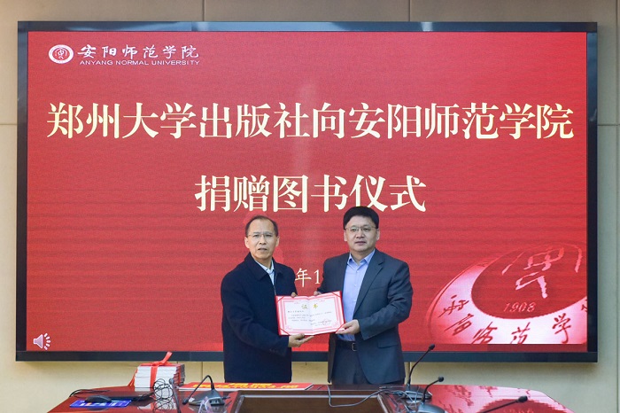 安阳师范学院副校长张建国向郑州大学出版社颁发捐赠证书
