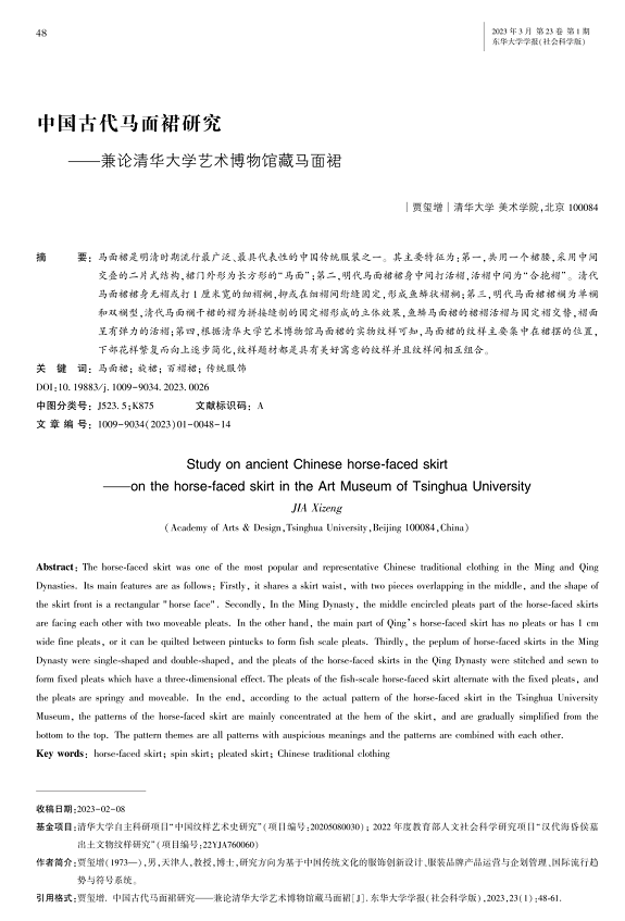 【摘要】马面裙是明清时期流行最广泛、最具代表性的中国传统服装之一。其主要特征为:第一,共用一个裙腰,采用中间交叠的二片式结构,裙门外形为长方形的“马面”,第二,明代马面裙裙身中间打活褶,活褶中间为“合抱褶”。清代马面裙裙身无褶或打1厘米宽的细褶裥,抑或在细褶间绗缝固定,形成鱼鳞状褶裥;第三,明代马面裙裙襕为单襕和双襕型,清代马面襕干裙的褶为拼接缝制的固定褶形成的立体效果,鱼鳞马面裙的裙褶活褶与固定褶交替,褶面呈有弹力的活褶;第四,根据清华大学艺术博物馆马面裙的实物纹样可知,马面裙的纹样主要集中在裙摆的位置,下部花样繁复而向上逐步简化,纹样题材皆具有美好寓意。