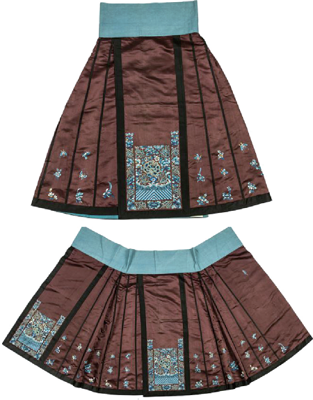 (清代酱紫缎地三蓝绣侧褶裙·清华大学艺术博物馆藏)