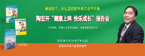 暑假即将来临,为了引导青少年健康上网,避免他们在假期里沉溺于网瘾,6月24号下午2:30——4:00“中国帮助未成年人戒除网瘾第一人”陶宏开教授将在王府井书店六层举办“健康上网 快乐成长”专题报告会。