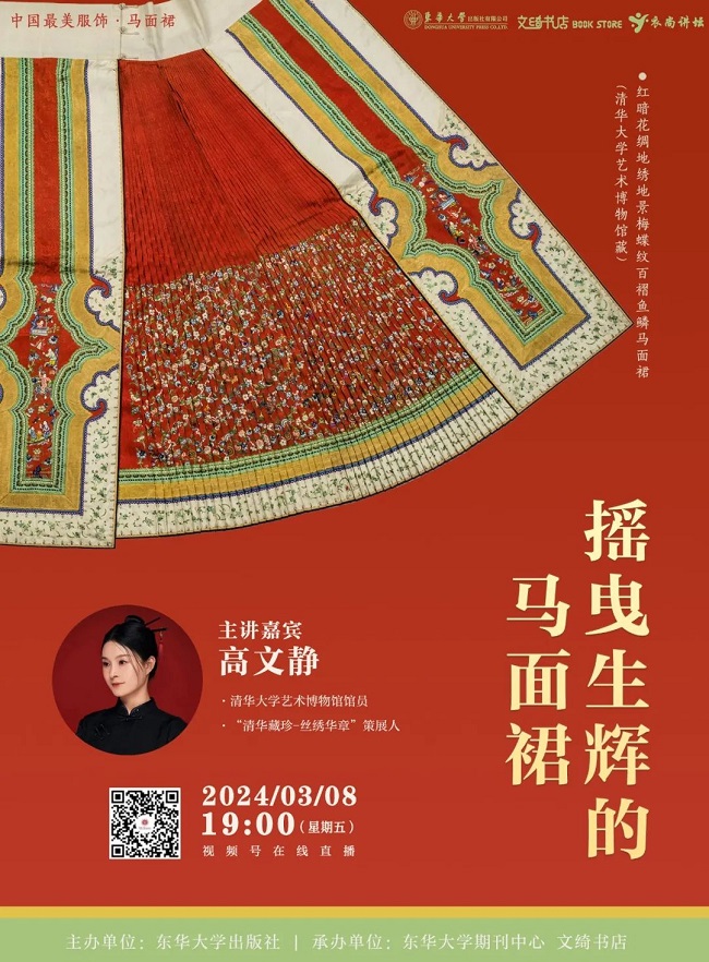本次讲座邀请清华大学艺术博物馆馆员,“清华藏珍-丝绣华章”策展人高文静,从现存马面裙实物开始,为我们讲解摇曳生辉的马面裙。