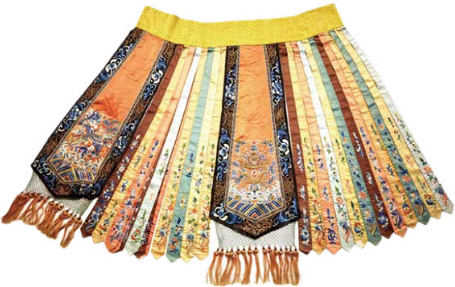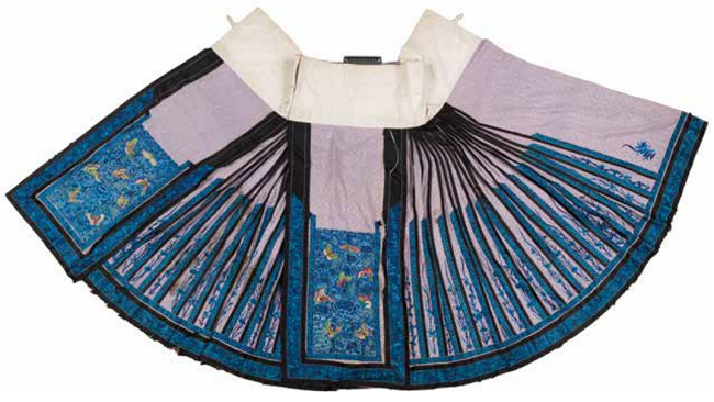 (清代酱紫缎地三蓝绣侧褶裙 清华大学艺术博物馆藏)