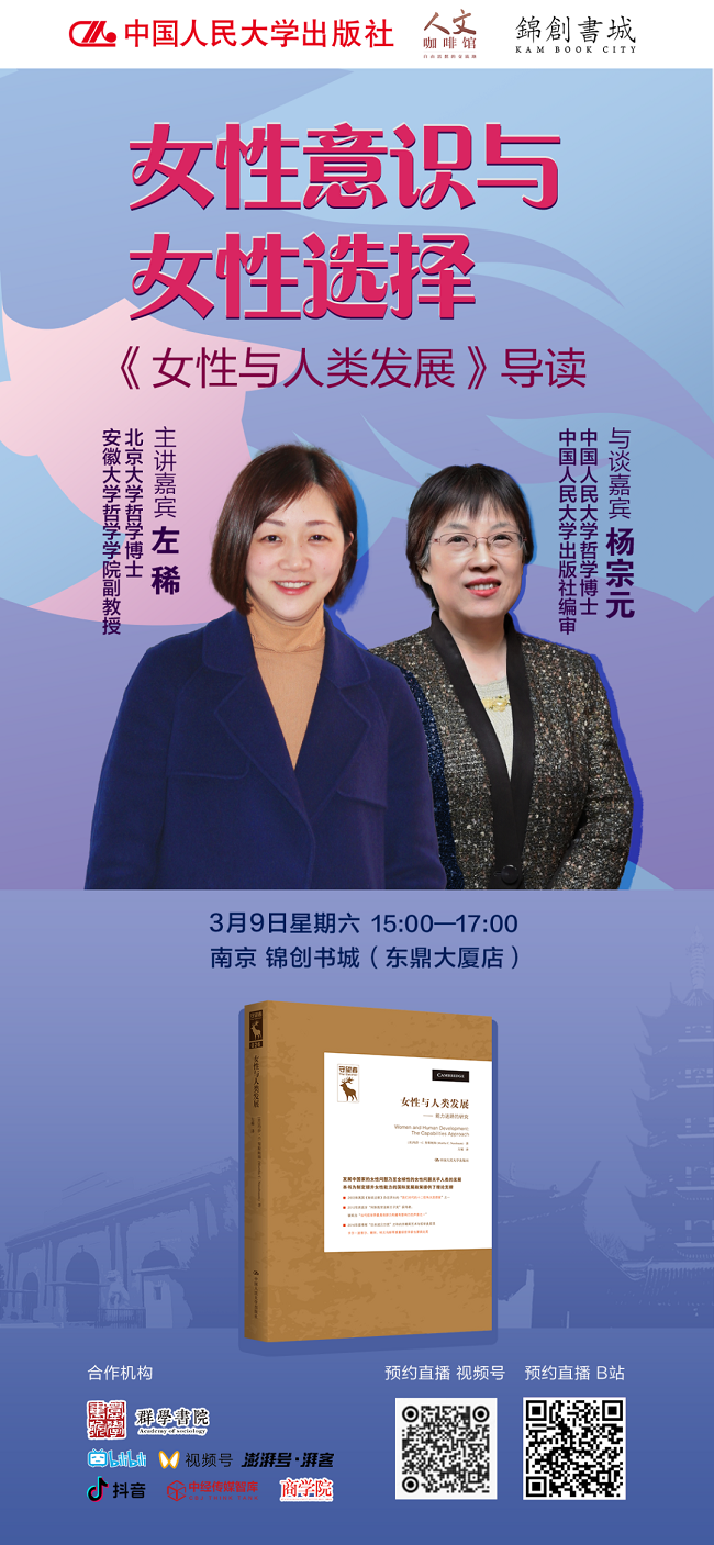3月9日,《女性与人类发展》一书译者、北京大学哲学博士,安徽大学哲学学院副教授左稀,与中国人民大学出版社编审、《愤怒与宽恕》一书译者杨宗元,将开展一场关于努斯鲍姆和女性意识的对话。