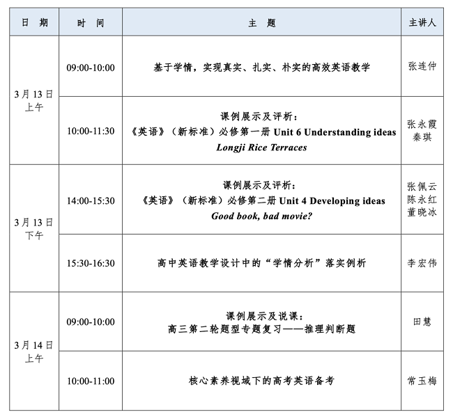 培训内容包括基于学情的高效英语课堂创建,《英语》(新标准)高中教材主题理解(Understanding ideas)和思维拓展(Developing ideas)板块阅读语篇的课例展示及专家评课,《英语》(新标准)高中教材的学校实施经验分享,高中英语教学设计中的“学情分析”落实例析,以及高三第二轮题型专题复习课例和高考备考指导。培训专家包括教材副主编、省市级教研员、学校教研室主任及优秀一线教师。