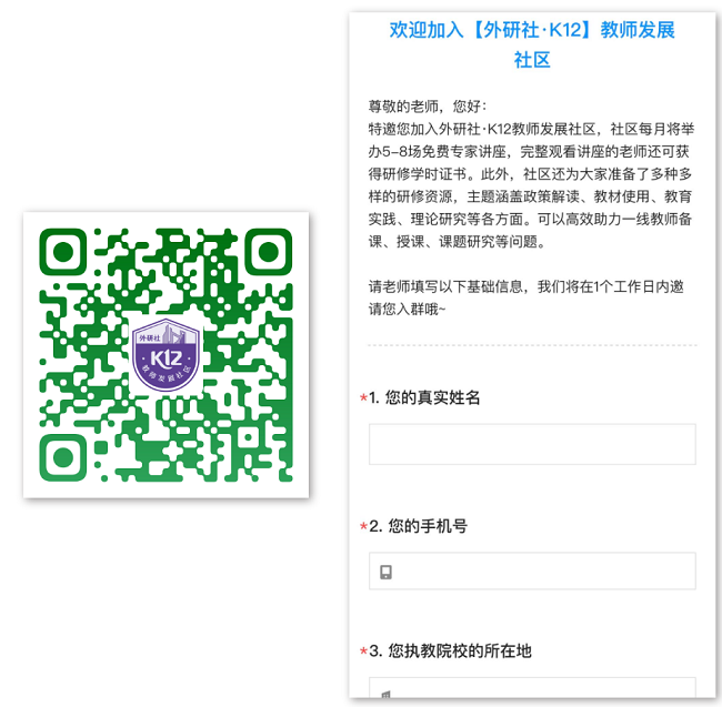本系列在线培训通过 “外研社·K12教师发展社区”进行。请您于3月11日18:00前,下载钉钉手机APP并使用钉钉扫描下方二维码,填写相关信息,申请加入“外研社·K12教师发展社区”。工作人员将根据备注邀请您进入相应群中,届时您在群中可完成直播收听。