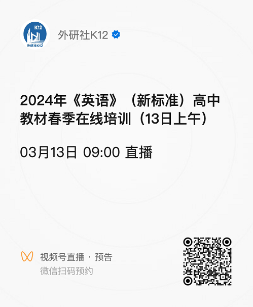 通过“外研社K12”视频号预约直播(无学时证书)。长按识别下方二维码,即可一键预约。