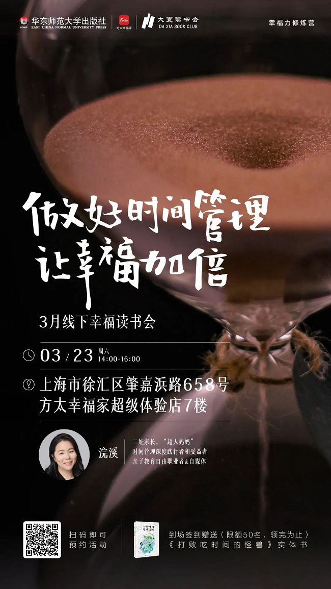 2024年3月23日14:00,时间管理达人、“超人妈妈”浣溪老师将作客方太幸福家超级体验店(上海肇嘉滨路658号方太幸福家7楼),和我们一起共读《打败吃时间的怪兽》,并邀请现场读者一起学习制作“时间轮”,从时间管理的角度助你提升幸福力。