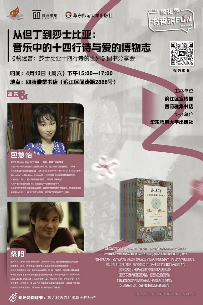 4月13日15:00~17:00,国内深耕中世纪与文艺复兴文学的包慧怡老师、来自意大利的桑阳老师,将在春天的午后,与我们分享流淌在十四行诗中的诗意。