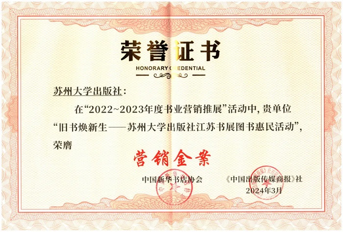 苏州大学出版社“旧书焕新生--苏州大学出版社江苏书展图书惠民活动”荣膺“营销金案”,营销部业务经理焦统一荣膺“创新管销人”,营销部业务经理翁琦晔荣膺“新锐主播”。