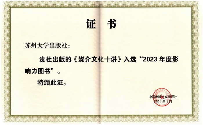 另外,在《中国出版传媒商报》公布的“2023年度影响力图书”书单中,苏州大学出版社出版的《媒介文化十讲》入选“2023年度影响力图书”