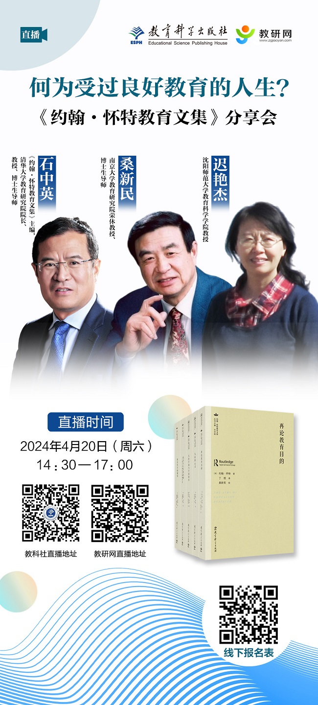 适逢2024年世界读书日,为更好地向读者分享约翰·怀特的教育思想,教育科学出版社、教研网将联合举办名家·名师面对面第32期“何为受过良好教育的人生?——《约翰·怀特教育文集》分享会”,特邀文集主编、译者与读者交流,欢迎广大读者朋友届时线上、线下积极参与!