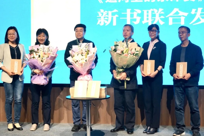 左起:《运河上的京津冀》责任编辑王玉荣、中广联合会有声阅读委员会副秘书长郝卫群、主编李建臣、主笔陈喜波、首都经济贸易大学出版社社长杨玲、首都经济贸易大学出版社总编辑孟岩岭