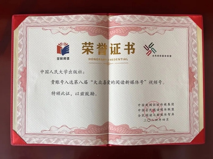 自2016年起,“大众喜爱的阅读新媒体号”推荐活动连续八届对优质的阅读新媒体号进行推荐,这是人大出版社第4次荣获该项荣誉。此前,官方微信公众号中国人民大学出版社分别荣获首届和第二届“大众喜爱的50个阅读微信公众号”,官方哔哩哔哩和喜马拉雅账号同时入选第七届“大众喜爱的阅读新媒体号”。未来,人大出版社将继续紧跟时代、紧抓读者,从内容质量与传播力、影响力方面下功夫,希望读者能够做到开卷有益、阅有所获。