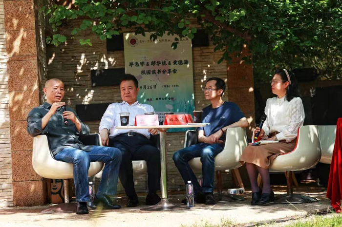 活动伊始,毕飞宇、邱华栋、黄德海三位作家和校园作家赵炜进行深入对谈,他们以自身丰厚的创作经历为蓝本,与在场师生分享了个人在文学创作旅途中的点滴感悟。在互动提问环节,作家们与现场师生展开深入交流,围绕文学对情绪焦虑的心灵剂用、文学创作的心路历程、文学作品影视化改编等话题热烈讨论,展开了一场别开生面的思想交锋和深度对话。
