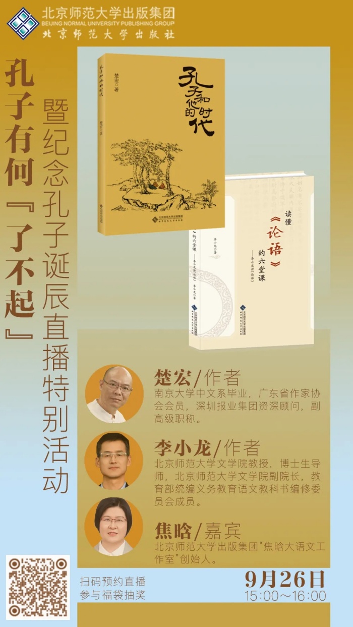 9月26日,为纪念孔子诞辰,北京师范大学出版社将举办孔子有何“了不起”暨纪念孔子诞辰直播特别活动,在《孔子和他的时代》中与大家一同走近孔子,了解他真实的一生。并通过《读懂<论语>的六堂课——李小龙讲<论语>》解决读者《论语》教与学中遇到的问题,让《论语》不再“难读”“难背”“难讲”。