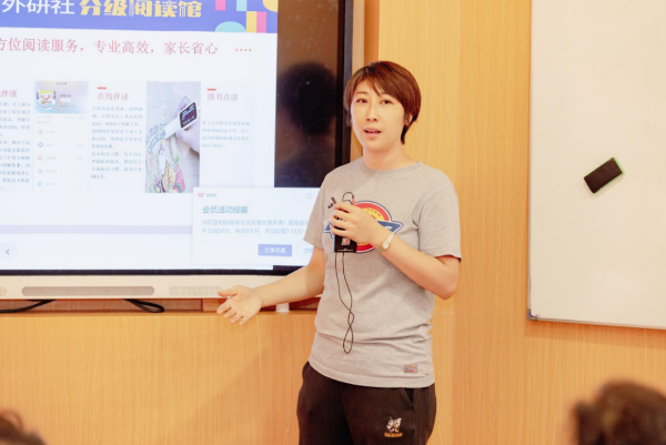 外研社阅读出版分社社长许海峰主持授牌仪式。外研社销售中心总监刘锋、北京外研在线副总裁兼基教事业部总经理郎崧出席了本次活动,与家长们共同见证这一重要时刻。