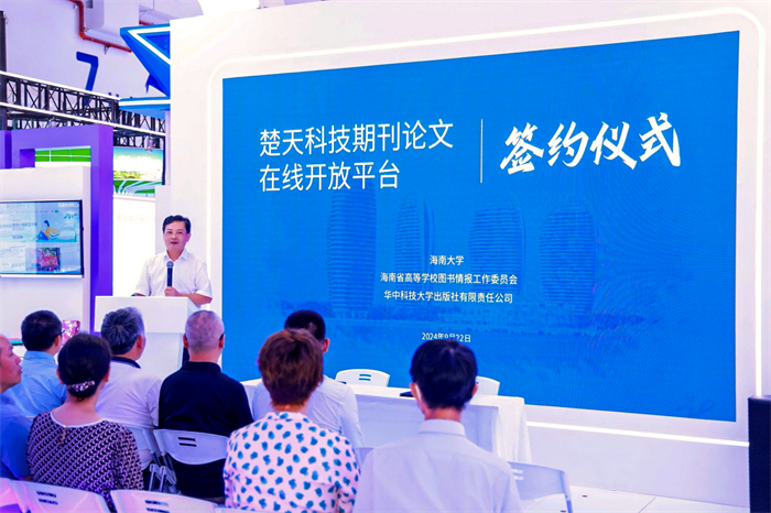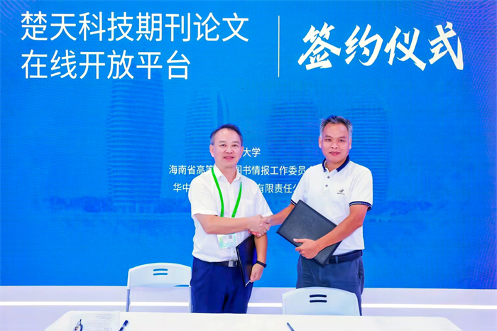 9月22日上午,华中科技大学出版社与海南大学、海南省高等学校图书情报工作委员会举行签约仪式,授权使用楚天平台。湖北省委宣传部二级巡视员张儒、出版管理处调研员徐颖、出版管理处副处长胡峻出席了本次活动,海南大学党委常委、副校长高佃恭,华中科技大学出版社社长阮海洪为本次签约发表致辞。楚天平台(https://journal.hustp.com/)是由湖北省科协主办、华中科技大学出版社承办的全国首家省级科技期刊论文开放平台。该平台汇聚了湖北省科技期刊论文及省内科研机构、高等院校等科研成果,以论文开放获取的方式打破学术信息交流壁垒,降低科技成果传播成本。此外,平台还通过对接科创湖北平台,贯通科技论文、成果与专家信息,有力推动科研成果的转化应用。平台现有期刊104种,科技论文近50万篇,位居全国科技期刊集群第三,论文涵盖主要科技领域,面向公众免费开放。签约后,海南大学等28所高校将能更加便捷地使用楚天平台的学术资源。