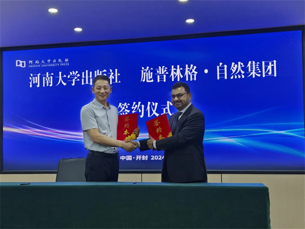 2024年9月25日,施普林格·自然出版集团全球人文社科及参考工具书项目副总裁阿尼尔·尚迪(Anil Chandy)、中国区图书总监李琰、亚特兰蒂斯出版社总经理党冉、大型参考书执行编辑董海芹、亚特兰蒂斯出版社高级编辑普丽亚·维亚斯(Priya Vyas)等一行访问河南大学出版社,签署合作协议,决定在联合开发选题、中外文同步出版、学术资源共享、版权互相引进、国际化品牌建设等方面开展全面深入合作。