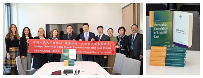 当地时间17日上午,人大出版社代表团前往位于德国海德堡的施普林格·自然集团总部进行商务访问,与施普林格·自然集团联合举办《刑法的人性基础》英文版新书发布会。谢富胜总编辑、郭晓明副总经理一行与施普林格·自然集团商业、经济、政治、法律出版业务副总裁克里斯提娜·布莱恩、执行编辑布丽吉特·雷斯克、中国区图书总监李琰共同为《刑法的人性基础》英文版揭幕。发布会后,双方就当前合作项目进行了深入探讨,交流和展望了下一步的合作计划,达成了深化长期战略伙伴关系、助力中国优秀学术成果国际传播、向世界提供中国方案的共识与愿景。