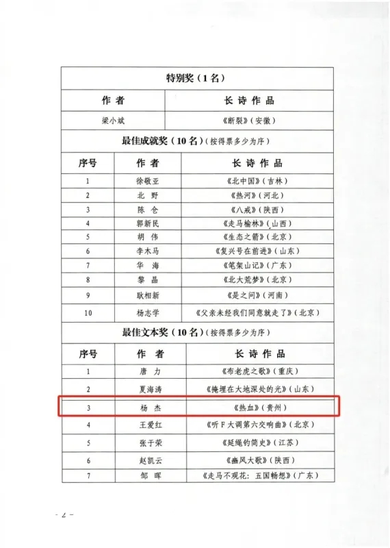 2024年12月31日,第九届中国长诗公益品鉴暨第九届中国长诗奖公布,全国获奖作品共38部(首)。贵州大学出版社出版的三线建设主题长诗《热血》(作者 :杨杰)获最佳文本奖。