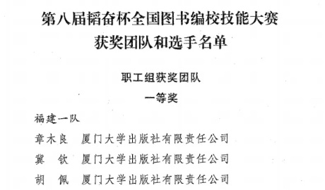 近日,第八届韬奋杯全国图书编校技能大赛结果出炉。根据《国家新闻出版署关于表彰第八届韬奋杯全国图书编校技能大赛获奖团队和选手的决定》(国新出发〔2025〕1号),由厦门大学出版社章木良、冀钦、胡佩组成的“福建一队”荣获职工组团队一等奖;章木良获编辑一等奖、胡佩获校对二等奖、冀钦获编辑优秀奖。