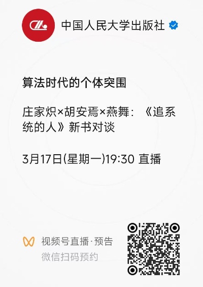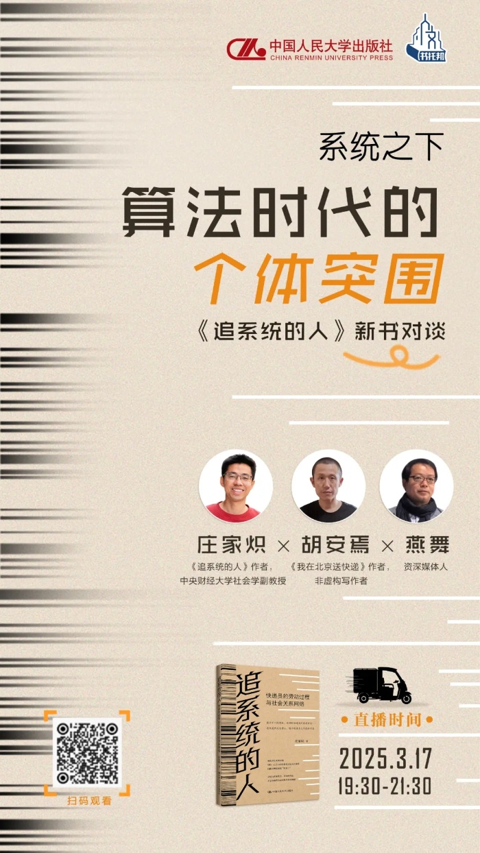 3月17日19:30,《追系统的人》作者、社会学学者庄家炽副教授,将与用文字记录多种工作生存真相的《我在北京送快递》作者胡安焉,在知名媒体人燕舞的主持下,共同打破“系统万能”的滤镜,聊聊算法时代的工作与人,探讨数字管理系统如何重塑劳动形态,以及劳动者在技术与效率挤压下的生存策略与人性力量。
