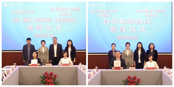 石竹青、常小玲代表双方签署《辽宁师范大学、外语教学与研究出版社共建“国际人才培养基地”合作框架协议》。王星、常小玲代表双方签署《辽宁师范大学出版社、外语教学与研究出版社合作框架协议》。