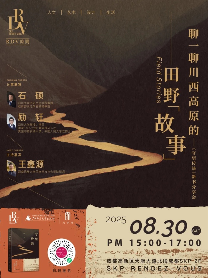 2025年8月30日(周六)15:00,我们邀请四川大学历史文化学院教授、教育部长江学者特聘教授石硕携新作《守望传统:在田野寻找人文》,同四川大学教授、博导励轩老师以及西南民族大学民族学与社会学院讲师王鑫源博士一道做客成都SKP 2F SKP RENDEZ-VOUS。届时,石硕教授将首次公开分享他多年深入川藏地区田野调查的所见所闻、所思所悟,现场还原川西高原田野里的烟火与史诗。