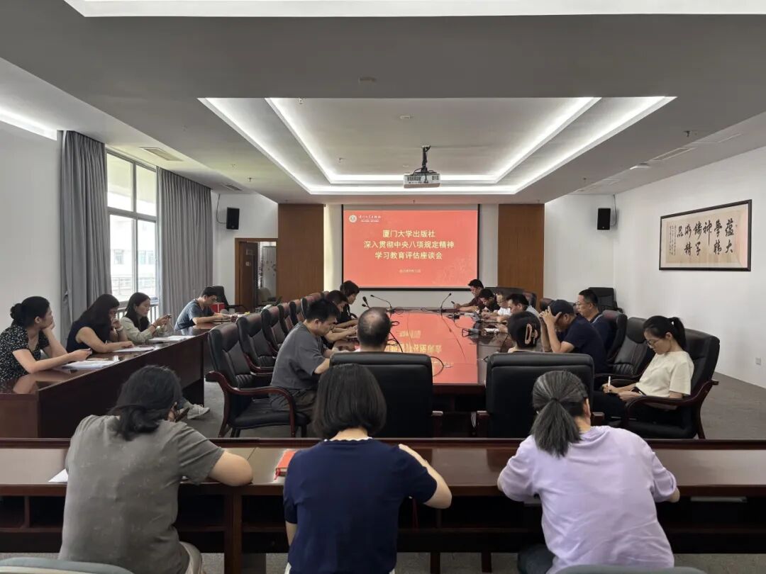 为推动厦门大学出版社党组织在深入贯彻中央八项规定精神学习教育中梳理盘点收获、总结经验,查漏补缺、改进提高,确保学习教育各项目标任务落细落地、善始善终,2025年9月12日上午,出版社党总支召开深入贯彻中央八项规定精神学习教育评估座谈会。会议由出版社党总支书记张伟主持,出版社领导班子、党总支委员、党支部书记、党内外员工代表参会。