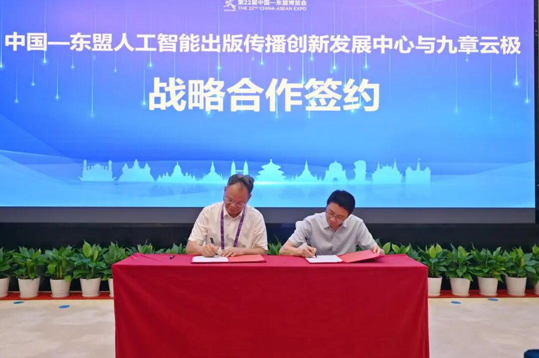 会上,新华出版社有限责任公司与北京九章云极科技有限公司、中国—东盟人工智能出版传播创新发展中心与北京九章云极科技有限公司、广西师范大学出版社集团有限公司与广西民族大学分别签订了战略合作协议,各方将在人工智能赋能文化传播与教育创新等关键领域,构建优势互补、协同共赢的合作新格局,共同探索融合发展的新路径与新模式。
