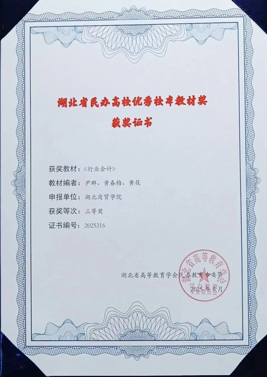 近日,湖北省首届民办高校优秀校本教材评选结果正式公布。由湖北商贸学院会计学院尹群、黄春梅、黄筱老师编著的《行业会计(第二版)》,在湖北省众多优秀参评教材中表现突出,荣获三等奖。