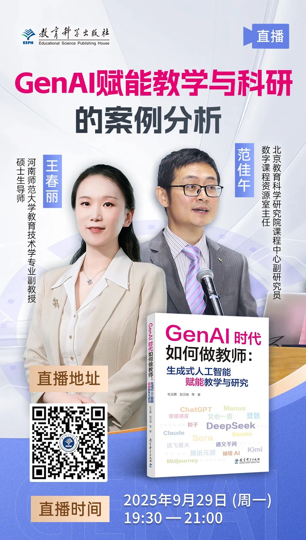 GenAI改变着教与学的方式,对教师在教育中的角色与职责提出了新要求和新挑战。那么,一线教师在运用GenAI赋能教学效能提升及教育教学研究时会遭遇哪些困境?GenAI时代的人机协同有什么新特征?AI能够在教学和科研的哪些环节有效介入?本次直播活动,您将从二位专家的分享中得到这些问题的答案。