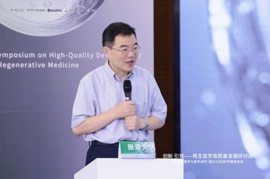 张宗久欢迎各位专家莅临会场,祝贺会议召开,谈到再生医学发展与国家战略、人民需求紧密相关,国家从“健康中国2030”到“十四五”持续出台政策支持其发展,为高校和医院实践提供空间。清华大学医学院依托多学科优势,构建 “清华医学体系”,在再生医学基础研究与临床转化上发力,打通全链条。清华医院管理研究院将搭建协作平台,推动学术成果转化传播。张宗久表示当前再生医学尚处探索阶段,需专家共同探索相关问题,期待借研讨会推动学术交流、人才培养与产业协同,让成果服务人民健康。