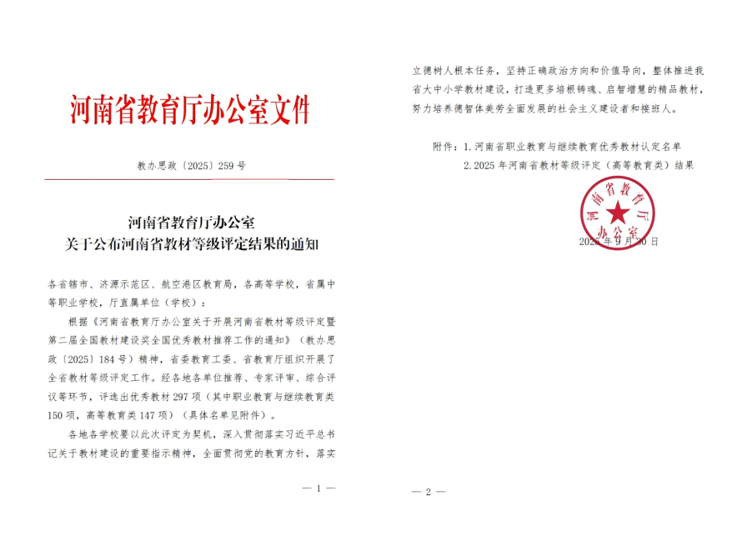 近日,河南省教育厅下发《河南省教育厅办公室关于公布河南省教材等级评定结果的通知》(教办思政〔2025〕259号),公布“河南省职业教育与继续教育优秀教材认定名单”及“2025年河南省教材等级评定(高等教育类)结果”。此次河南省教材等级评定,是根据第二届全国教材建设奖评选工作精神,由河南省委教育工委、河南省教育厅组织开展,经河南省各地各单位推荐、专家评审、综合评议等环节,评选出全国范围内出版的优秀教材297项(其中职业教育与继续教育类150项,高等教育类147项),主要表彰近年来河南省在教材建设中取得突出成绩的先进单位,旨在整体推进河南省大中小学教材建设,打造更多培根铸魂、启智增慧的精品教材。