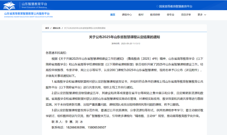 另外,由作者担任课程负责人的“物理学专业英语”(该课程已于2021年入选山东省一流课程)再次成功入选2025年山东省智慧课程建设项目。