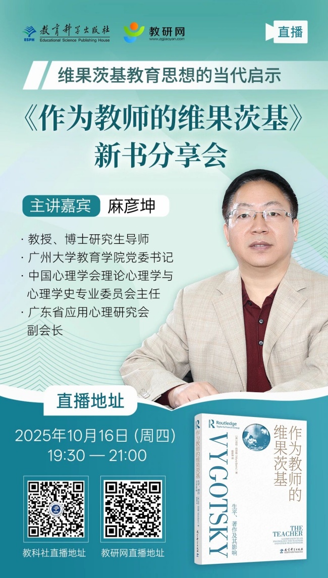 10月16日,教育科学出版社、教研网将联合举办“名家·名师面对面”系列活动第45期,特邀《作为教师的维果茨基》译者、广州大学教育学院的麻彦坤教授,结合多年的研究经验,为我们梳理维果茨基的理论渊源,带我们探寻维果茨基思想的重要价值和当代启示。本次直播活动希望帮助教育工作者真正理解维果茨基思想的核心及其在当下依旧焕发勃勃生机的原因,助力理论研究和教学实践,让教育更有温度、更有深度。
