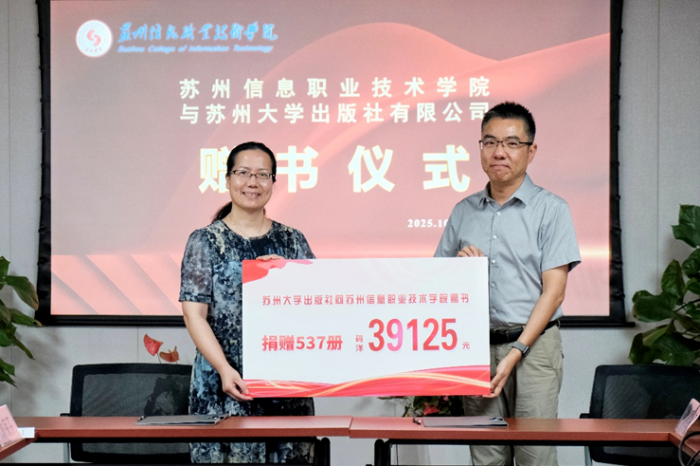 10月11日下午,苏州大学出版社(以下简称“苏大社”)与苏州信息职业技术学院(以下简称“苏信院”)举行了战略合作协议签约暨赠书仪式。