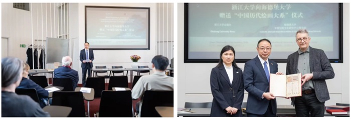 浙江大学出版社党委书记、董事长吴晨,浙江大学出版社总编辑陈洁教授分别向海德堡大学校方赠予“中国历代绘画大系”和《中国丝绸艺术大系·故宫卷》,仪式由海德堡大学CATS图书馆馆长Hanno Lecher主持。海德堡大学东亚美术史前任所长、德国海德堡科学院Lothar Ledderose教授,海德堡大学国际关系处Dietlind Wünsche博士,海德堡大学CATS图书馆东亚部副主任及汉学系研究馆员孙慧博士,海德堡大学语言学院讲师李莹等专家学者等共同见证。