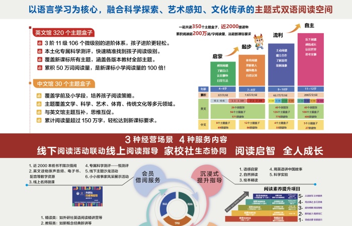 外研社分级阅读馆是外研社积极响应全民阅读战略,落实《全国青少年学生读书行动实施方案》,聚焦青少年阅读素养提升,专为4~12岁儿童创新打造的主题式双语阅读空间。