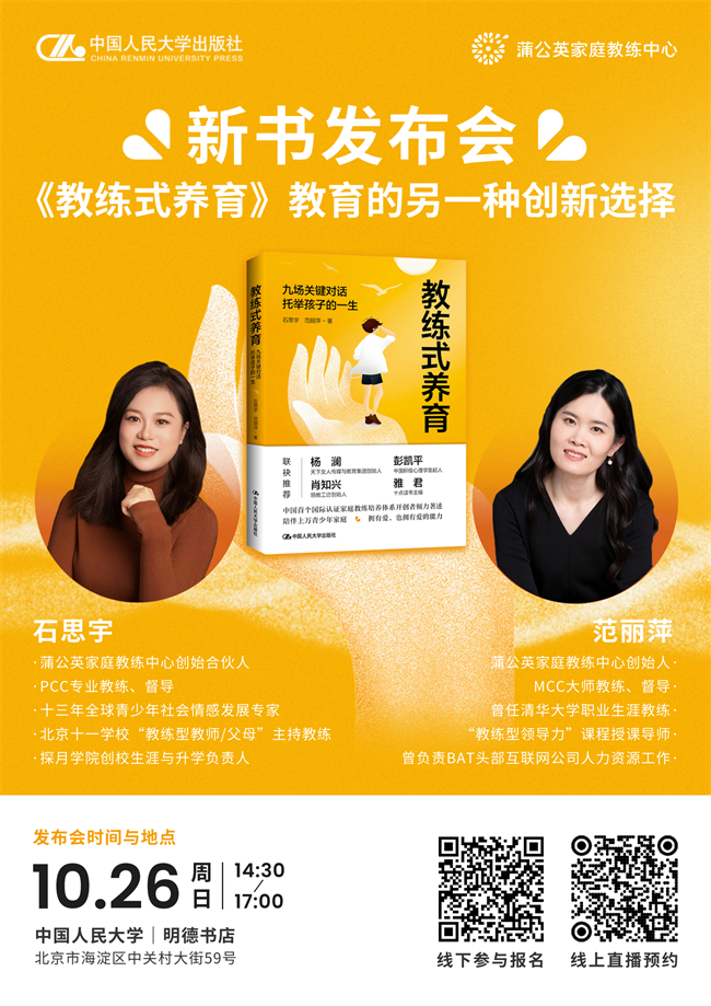 2025年10月26日下午14:30,中国人民大学出版社特邀《教练式养育》的两位作者石思宇及范丽萍老师做客中关村校区内的明德书店,围绕“教育的另一种创新选择”这个议题,与现场的你面对面沟通。