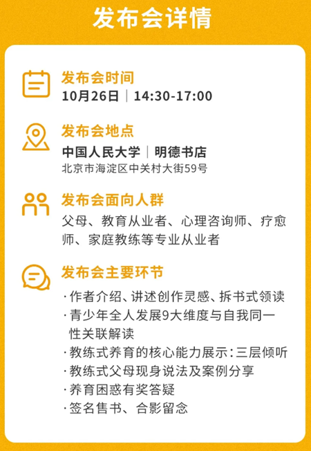 这是一场直接面向泛养育行业从业者以及青少年父母的分享会。在这里,两位作者将与你深度交流《教练式养育》创作背后的思考,通过拆书式领读,梳理“教练式养育”的核心逻辑。我们还将共同解读青少年全人发展9大维度与自我同一性的关联,让你更清晰理解青少年成长的底层需求。除此之外,还将在现场重点展示教练式养育的核心模型“三层倾听”,以及教练式父母分享的真实实践案例。期待你的到来!