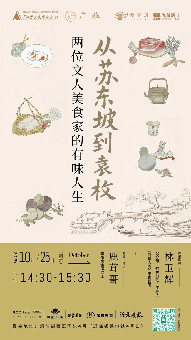10月25日,在苏州慢书房,作者林卫辉将围绕 “从苏东坡到袁枚:两位文人美食家的有味人生” 主题,带你深入两本书的创作细节 —— 看苏东坡如何在困境中 “自笑平生为口忙”,听袁枚怎样以 “讲究” 守护生活美学,在舌尖故事里,解锁属于你的生活调味剂。