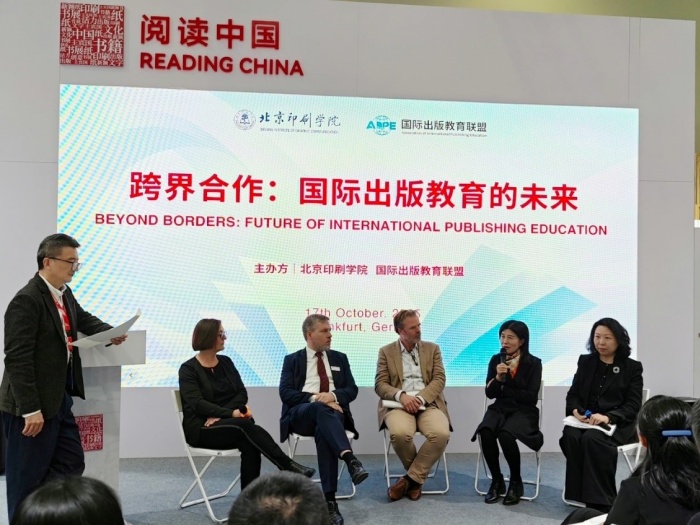 10月17日,王芳社长应邀出席北京印刷学院在书展主办的“跨界合作:国际出版教育的未来”对话论坛并作报告。她指出,面对出版业数智化转型与跨文化传播新挑战,国际出版教育需聚焦三大任务:制定国际化出版人才培养标准、打破产学壁垒建立实训基地、成立国际出版研究中心加速成果转化。作为国际出版教育联盟成员,外研社将开放数字平台资源,提供产教融合实践基地,并依托出版联盟等国际网络构建全球协作体系。论坛嘉宾还包括北京印刷学院出版学院副院长叶文芳、德国美因茨大学出版学博士安克·沃格尔(Anke Vogel)、施普林格・自然全球图书负责人及执行副总裁汤恩平、德古意特博睿联合首席出版官薄墨如(Maurits van den Boogert)。本次活动由语文出版社党总支书记、社长于春迟主持。