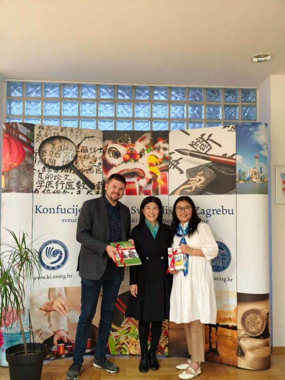 10月18日,王芳一行抵达克罗地亚萨格勒布,开启中东欧合作之旅。在萨格勒布大学孔子学院,代表团与萨格勒布大学外事副校长尤里察·帕维契奇(Jurica Pavicic)、孔子学院外方院长克雷索·尤拉克(Kreso Jurak)、中方院长杨海燕围绕国际合作出版、国际中文教育创新等议题交换意见。尤拉克院长向代表团详细介绍了克罗地亚中文学习情况及萨大孔院在中文教学、特色课程开发等方面的实践成果。双方明确将在“中文+职业教育”、数字出版、国际中文教师培养等领域加强合作,为中克两国在经贸往来、文化理解等方面培养优秀人才。同时,双方还就合作出版“语言+专业”教材达成意向,计划通过国际化团队编译与联合推广,促进中克两国乃至中东欧地区的双向学术与文化交流。会后,王芳代表外研社向孔院赠送《中文900句》《新时代经贸汉语口语》等中文学习和中国主题类图书。