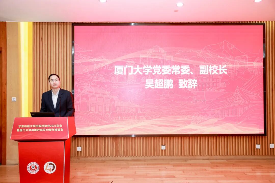 吴超鹏首先致辞,他谈到,大学出版作为知识价值链上的重要环节,不仅承担着学术成果传播使命,更在知识再生产过程中发挥着独特作用。他充分肯定了厦门大学出版社作为厦门大学重要组成部分,建社40年来,依托学校优势学科出版的一系列标志性成果,为学校学科建设与学术声誉提供了有力支撑。他表示,厦门大学将一如既往支持出版社的改革发展,推动出版社事业迈向更高质量、更有效率、更可持续的发展新阶段。