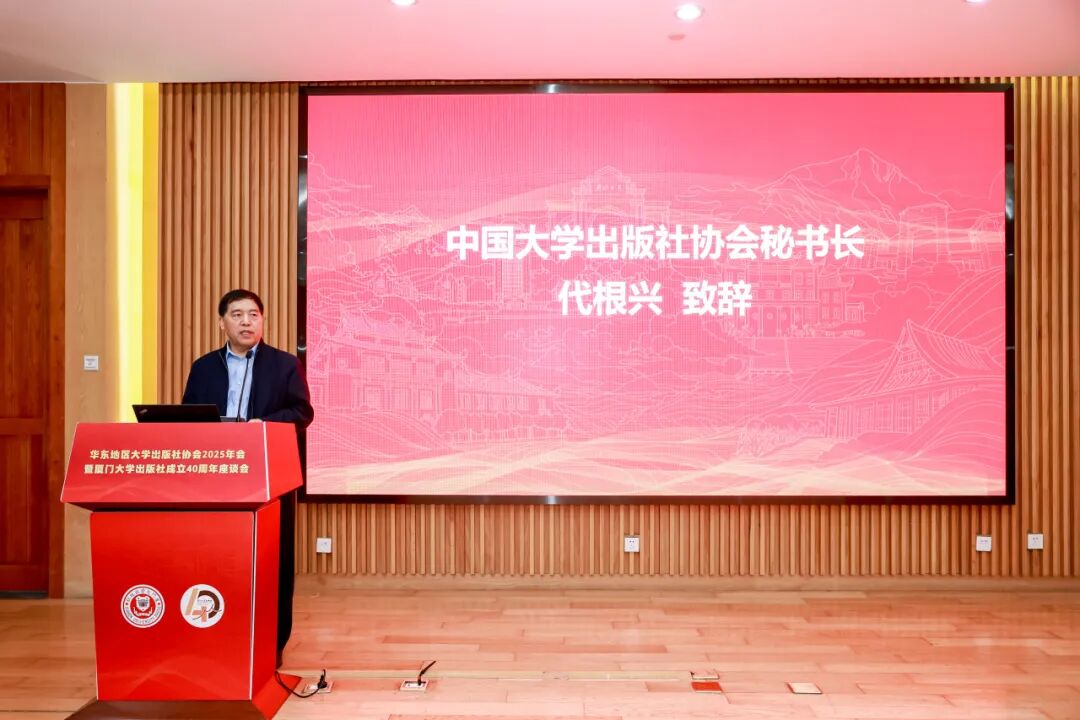 代根兴在致辞中高度评价厦门大学出版社40年来坚持“蕴大学精神、铸学术精品”的出版理念,在台湾研究、东南亚研究等领域形成鲜明特色,经管、法律等系列教材影响广泛,已成长为特色鲜明、品牌成熟的重要出版力量。他强调,大学出版社作为中国出版事业的国家队和学术建设的主力军,要心怀“国之大者”,正确处理“守正”与“创新”的关系,为教育强国、文化强国建设贡献大学出版人的智慧与力量。